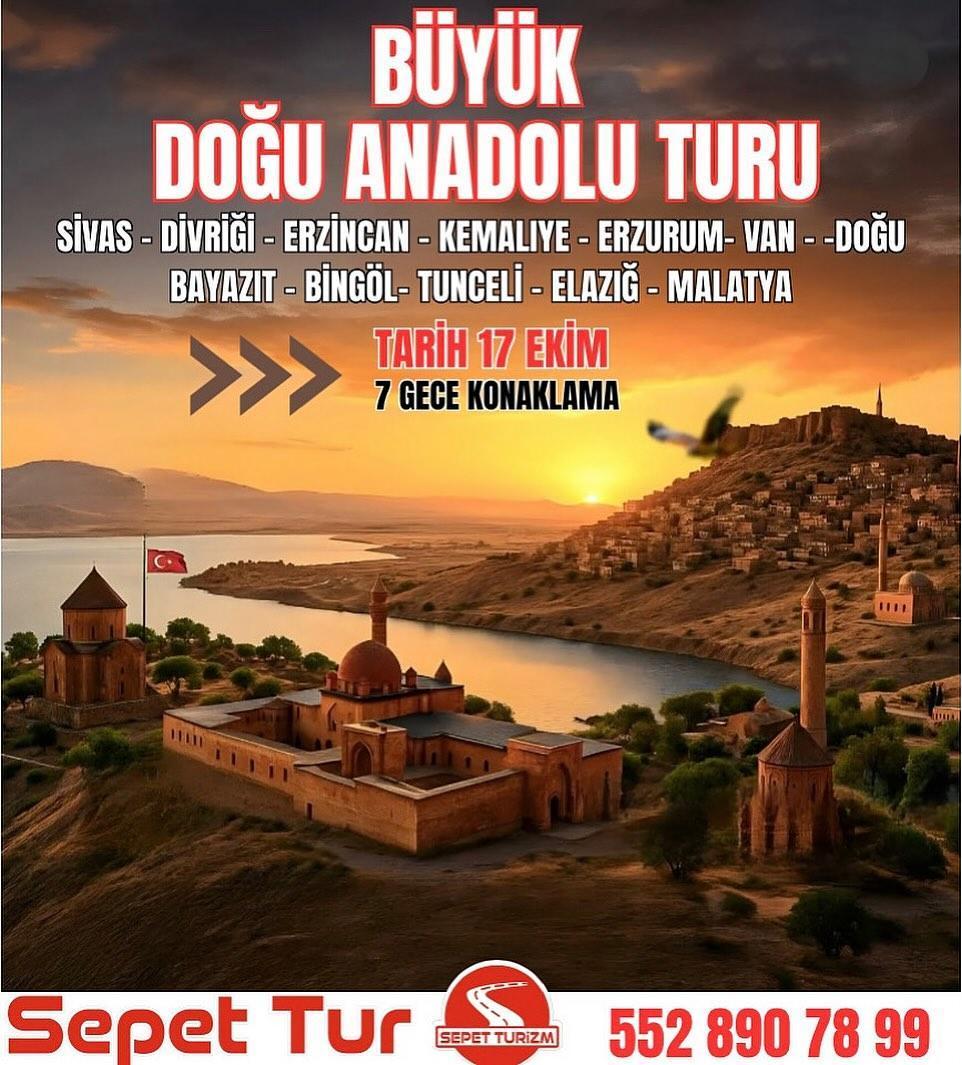 Sepettur, Denizli çıkışlı Doğu Anadolu turlar kapsamında tüm programı titizlikle organize eder. Katılımcılar, sadece keşfetmenin keyfini yaşar. Rezervasyon ve detaylı bilgi için 0552 890 78 99 numarası kullanılabilir.